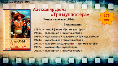 роман Александра Дюма «Три мушкетера»,написанный в 1844 г., и